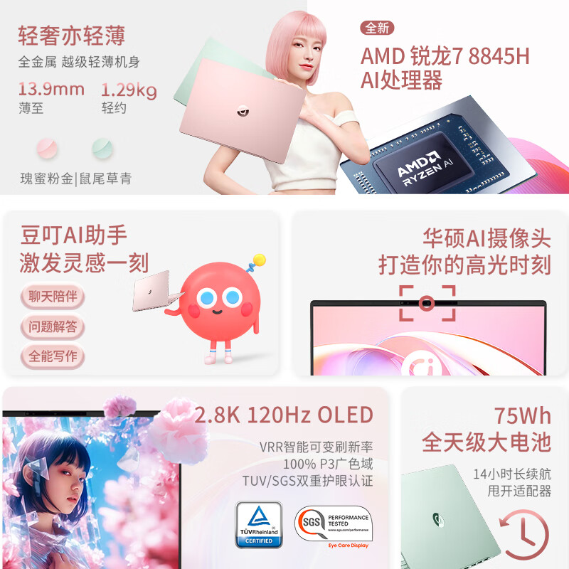 华硕a豆14Air悦享版 笔记本-M3407ADOL(R9-270H/16G/1T/集显 鼠尾草青)2.5K