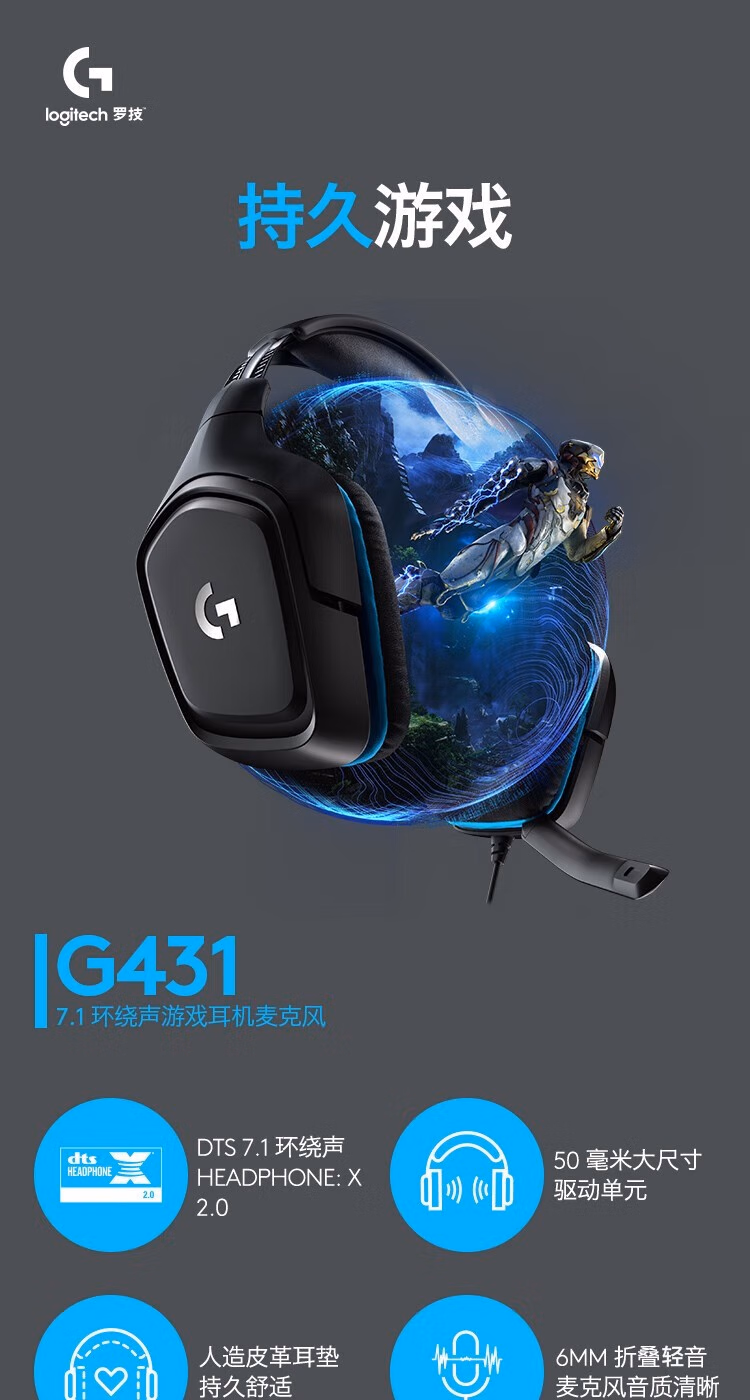 罗技 G431有线游戏耳机头戴式7.1环绕音立体声带麦克风 吃鸡耳麦听声辩位